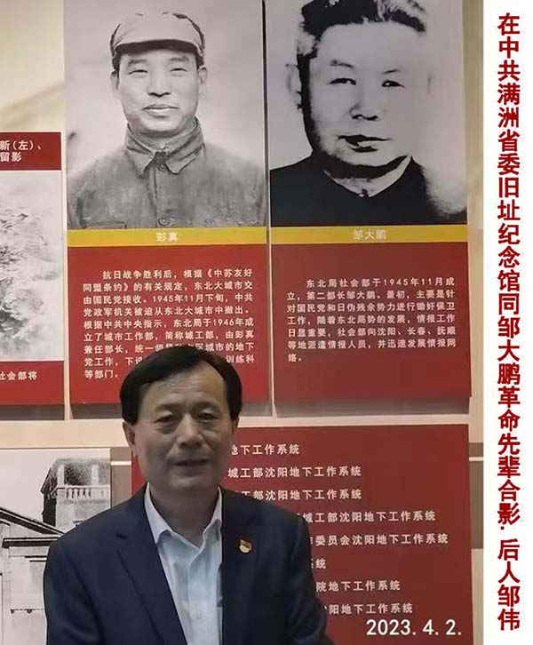 邹大鹏后人邹伟(右)同沈阳满洲省委旧址纪念馆,全国优秀讲解员沈子林合影纪念。2023.4.2